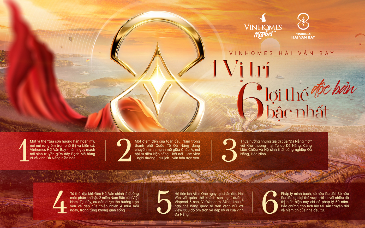 Vinhomes Hải Vân Bay là đại đô thị biển All In One đẳng cấp quốc tế, tọa lạc tại vị trí chiến lược khu vực Hải Vân – cửa ngõ kết nối Đà Nẵng và Huế. Dự án được định vị trở thành biểu tượng đô thị biển mới của Việt Nam, nơi hội tụ hoàn hảo giữa sống – nghỉ dưỡng – giải trí – đầu tư, mang đến chuẩn mực sống thượng lưu và tiềm năng gia tăng giá trị bền vững theo thời gian.